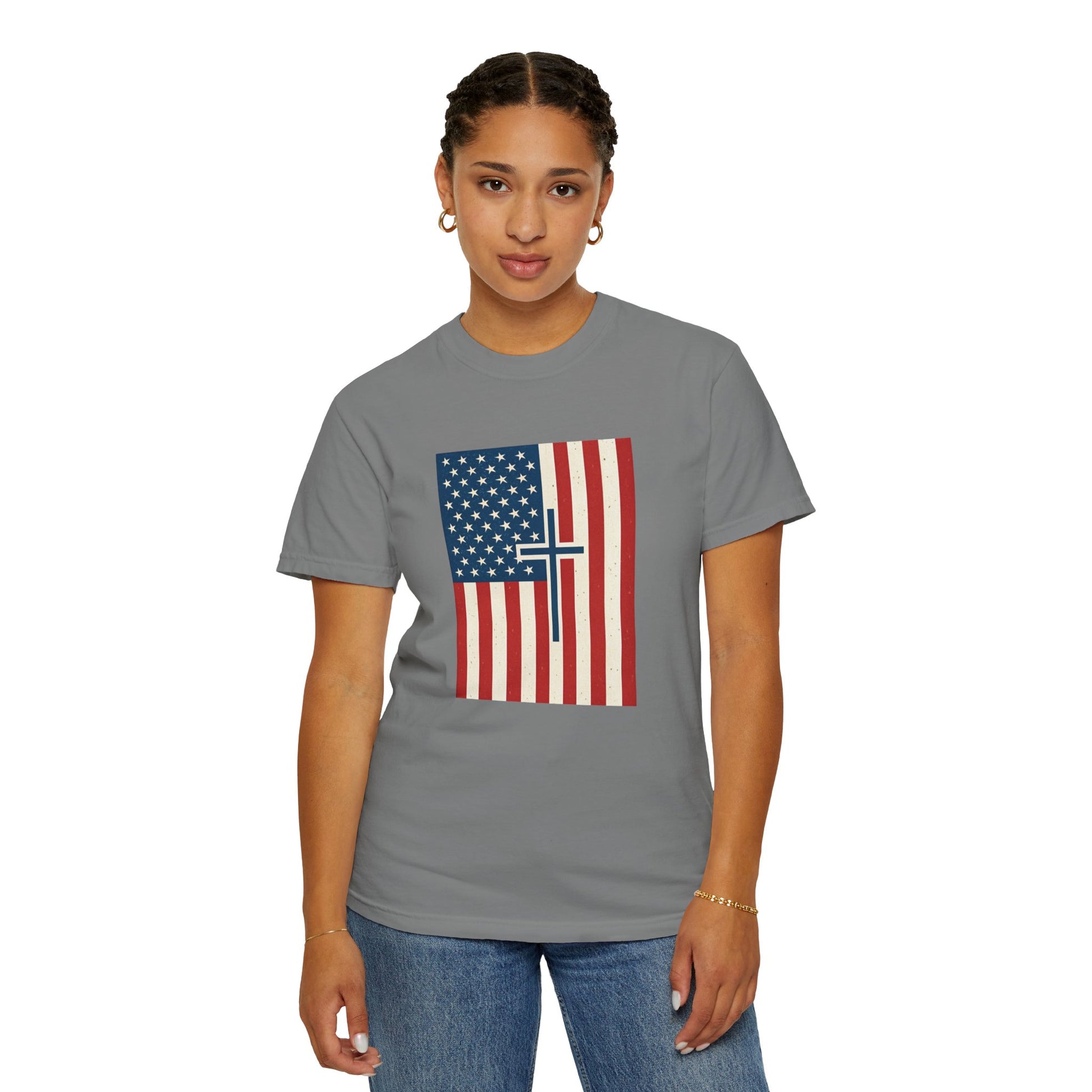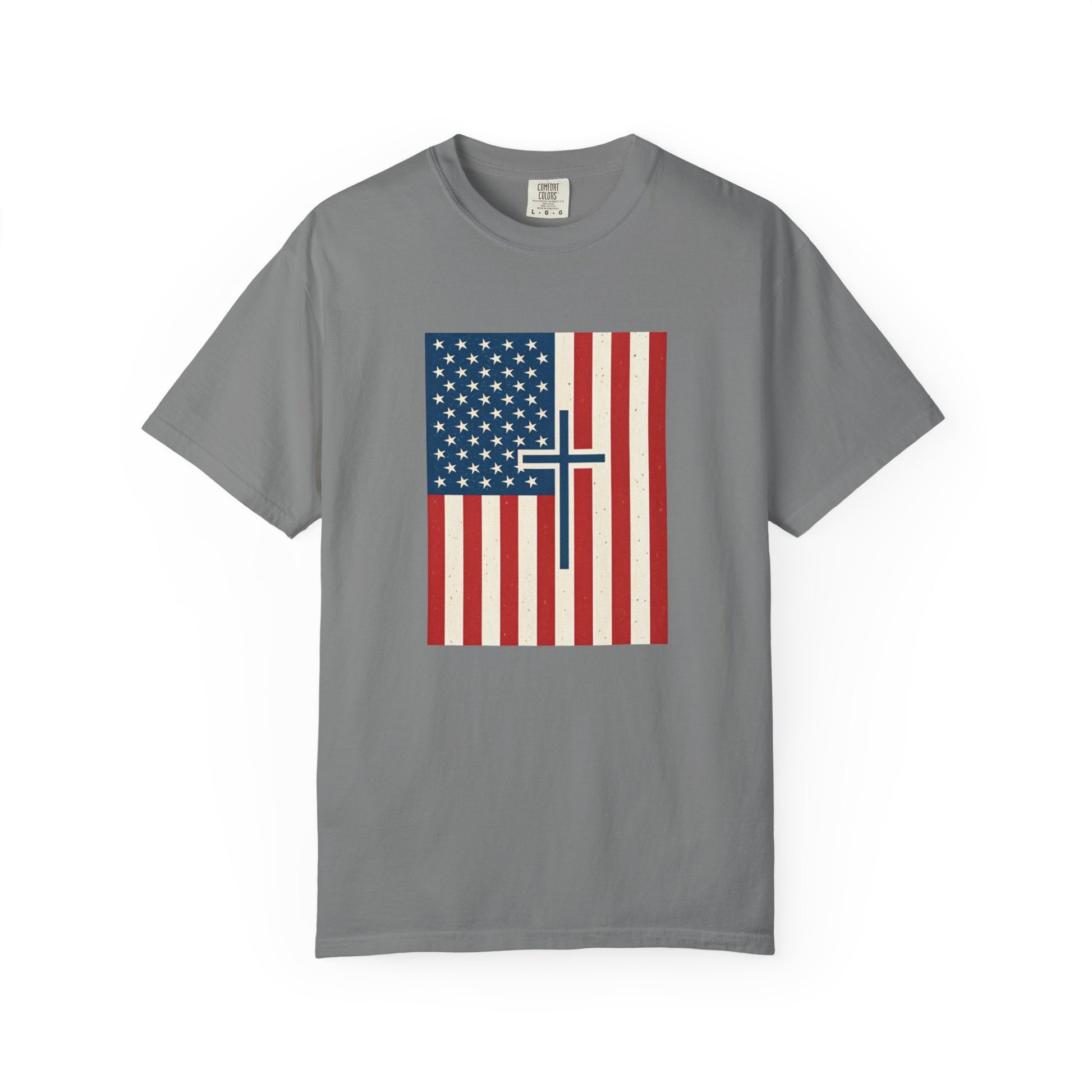 Celebrate faith and freedom with this bold Christian American flag design—where the cross meets the stars and stripes. Printed on a soft, high-quality Bella + Canvas tee, this shirt is a declaration of where you stand: One nation under God.
