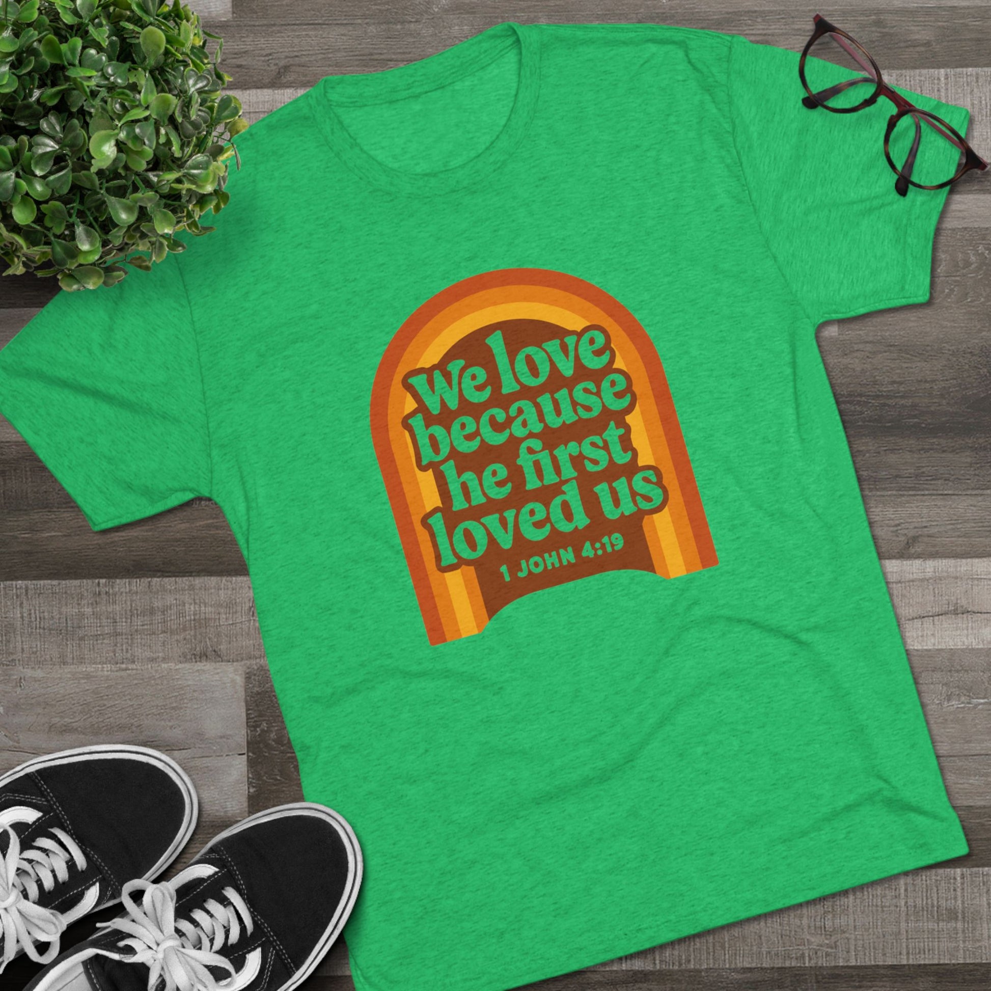 This throwback-style tee is bursting with joy and truth. Featuring the timeless words of 1 John 4:19 and a warm retro rainbow, it’s a conversation starter and a faith declaration all in one.