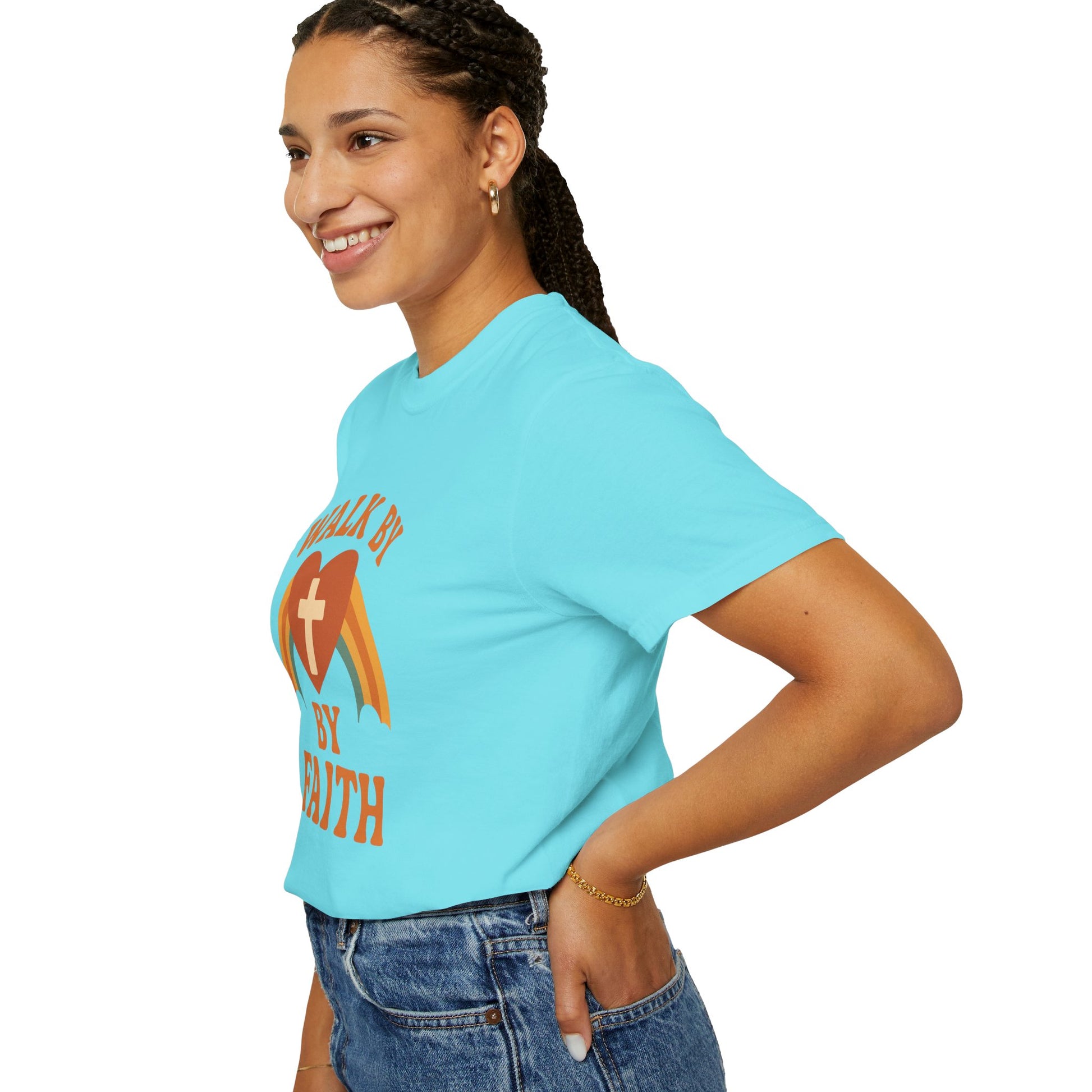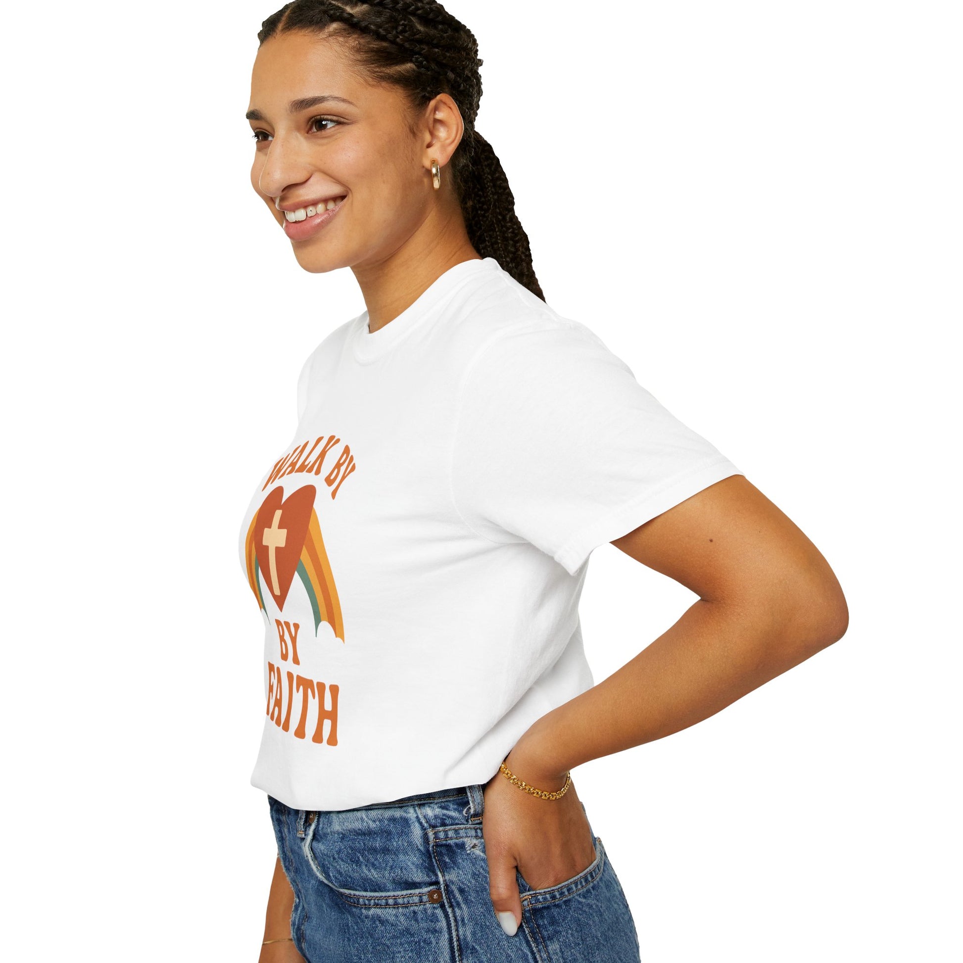 Faith isn’t just for Sundays—it’s a daily walk. This joyful, retro-style tee is a radiant reminder to trust what you can’t see. With its groovy vintage rainbow, warm sunset tones, and heart-shaped cross, this design brings sunshine and Scripture to every outfit.